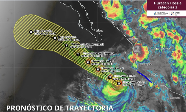 Su circulación y bandas nubosas ocasionarán lluvias intensas en Sinaloa. Para este miércoles, el huracán Flossie se desplazará al oeste de las costas de Jalisco, mientras se debilita gradualmente.