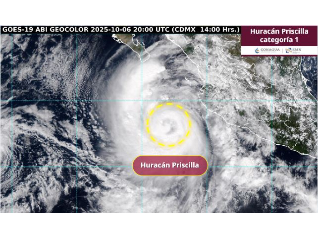 Las bandas nubosas y amplia circulación de Priscilla, mantendrán lluvias muy fuertes a puntuales intensas, fuertes rachas de viento y oleaje elevado en el occidente mexicano, condiciones que comenzarán a propagarse hacia Baja California Sur y Sinaloa.