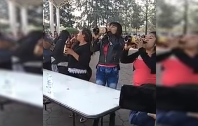 En redes sociales comenzó a circular un video en el que se observa a un grupo de cinco mujeres en el centro del patio de la secundaria “José Vasconcelos”, según informaron los cibernautas, mientras son apoyadas por un animador para beber el contenido de las botellas que tienen frente a ellas.
