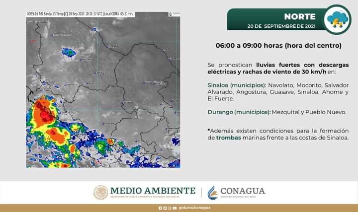 CIUDAD DE MÉXICO.- Para hoy, un canal de baja presión extendido sobre la Sierra Madre Occidental e inestabilidad en niveles altos de la atmósfera, ocasionarán lluvias fuertes en el noroeste y occidente de México, con lluvias puntuales muy fuertes en Sinaloa.