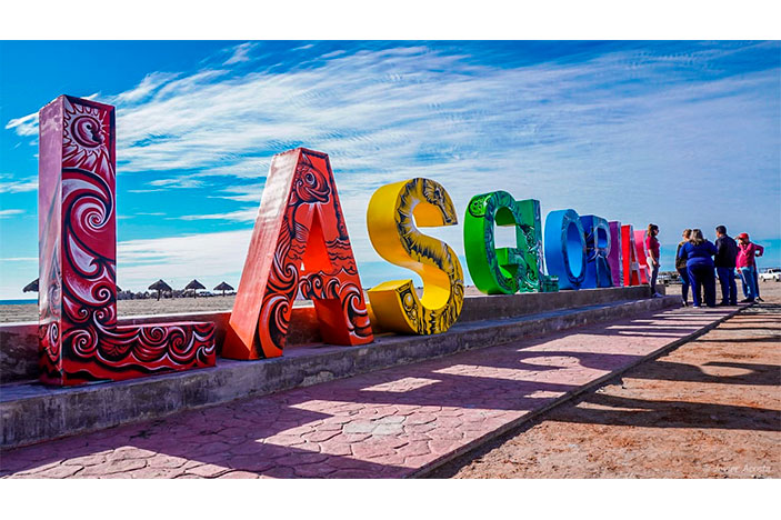Cada una de las letras tiene imágenes del aves, pesca, olas, animales marinos y playa elaborados por el muralista Alexis Gutiérrez.