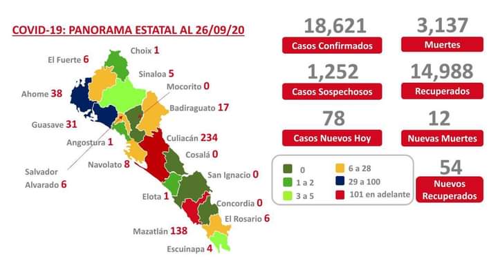 (54 nuevos. Culiacán 25, Guasave 14, Mazatlán 10, Mocorito 1, Sinaloa 1, El Rosario 1, Elota 1, Choix 1)
