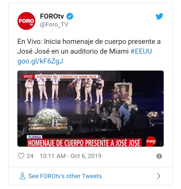 MIAMI, EU.- Con mariachi y acompañado de su familia, José José es despedido en el Miami Dade Country-Auditorium, donde se interpretarán sus grandes éxitos y se le dará el último adiós a “El Príncipe de la Canción”.