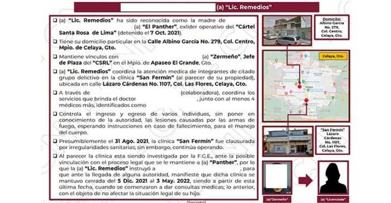 Y luego describe que “Lic. Remedios coordina la atención médica de integrantes del citado grupo delictivo en la clínica ‘San Fermín’ (al parecer de su propiedad), ubicada en calle Lázaro Cárdenas No. 1107, colonia Las Flores, Celaya”.