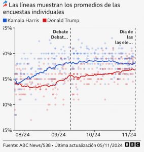 El promedio de encuestas nacionales elaborado por ABC News/538 indica que el apoyo a Harris se encuentra en torno a 48%, mientras que Trump obtiene 47%