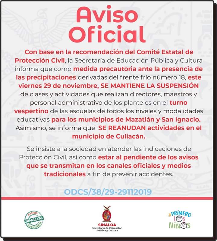 Mazatlán y San Ignacio para el turno vespertino con suspensión de clases