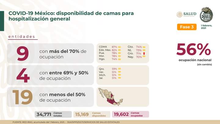 La ocupación hospitalaria de camas generales es de 56 por ciento a nivel nacional, con nueve entidades que superan el 70 por ciento.