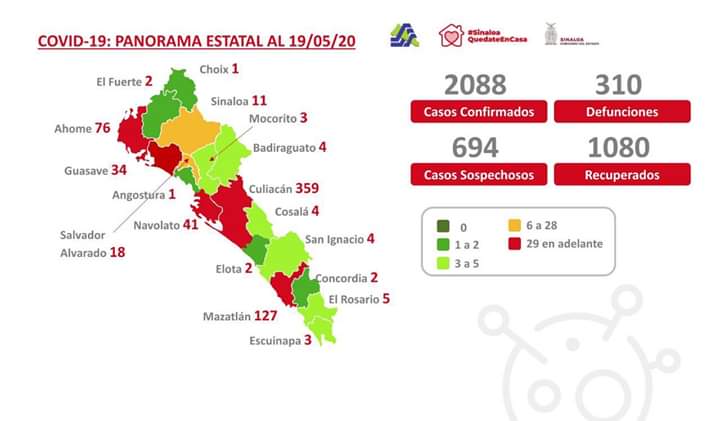 CULIACÁN, Sin.- Sinaloa presentó 13 muertes más para llegar a los 310 decesos (13 nuevas: 5 Culiacán, 4 Mazatlán, 2 Ahome, 2 Navolato).