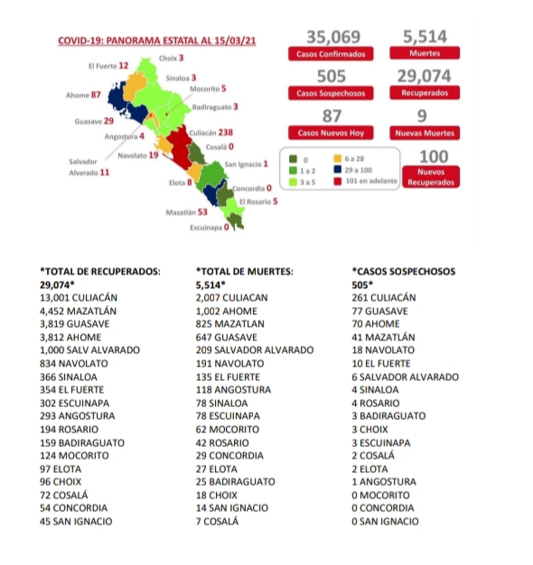 CULIACÁN, Sin.- Sinaloa rebasó los 35 mil casos de coronavirus con 9 nuevos fallecimientos reportados en las últimas 24 horas (Culiacán 4, Mazatlán 4, Elota 1).