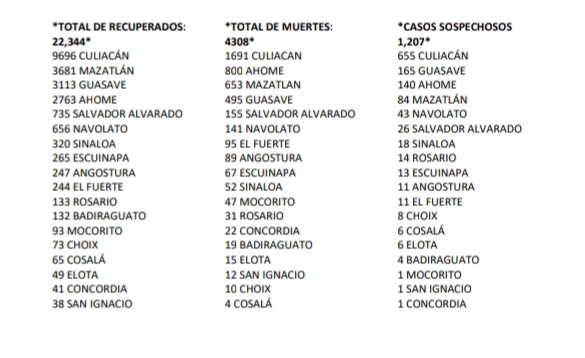 CULIACÁN, Sin.- El número de decesos por COVID-19 llegó este domingo a los 4 mil 308, informó la Secretaría de Salud.