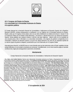 El documento va firmado por todos los integrantes de dicho Consejo, encabezados por el doctor Luis Armando González Plascencia, secretario general ejecutivo de la ANUIES, y va dirigido al Congreso de Sinaloa, a la Comunidad de la Universidad Autónoma de Sinaloa y a la opinión pública.
