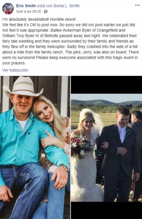 Eric Smith, un amigo de la familia de la novia, relató a través de una publicación en su página de Facebook que “el helicóptero de la familia” chocó contra “la ladera de una colina a una milla (1,6 kilómetros) del rancho familiar” y señaló que el piloto de la aeronave, “Jerry”, también murió en el accidente.
