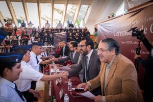 En compañía del rector de la UNIPOL, Óscar Fidel González Mendívil, y del titular del Secretariado Ejecutivo del Sistema Estatal de Seguridad Pública, Ricardo Jenny del Rincón, el presidente municipal celebró la graduación de los 119 cadetes, de los cuales 81 prestarán sus servicios como parte de la policía municipal de Culiacán.