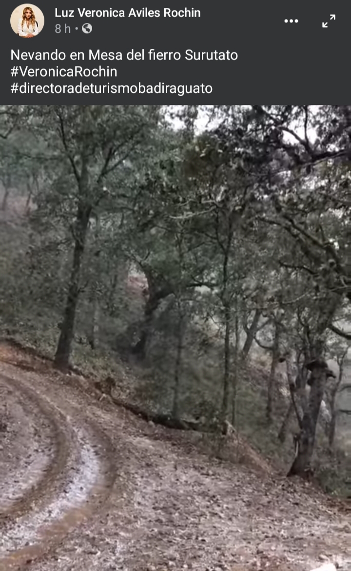 En un video transmitido a través de su cuenta de Facebook, Luz Verónica Avilés Rochín, muestra la caída de nieve sobre la localidad de Mesa del Fierro, Surutato.