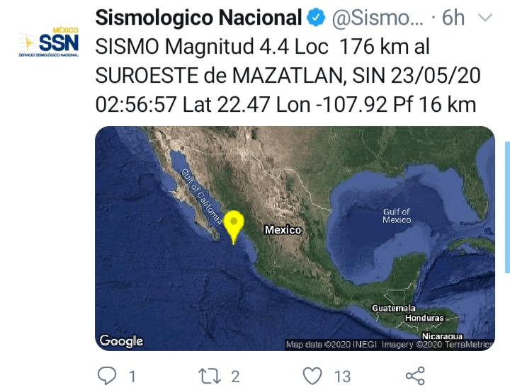 MAZATLÁN, Sin.- Un sismo de intensidad media se registró esta madrugada a 176 kilómetros al suroeste de Mazatlán.