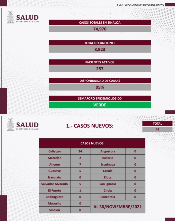 Además se reportan 44 casos nuevos, 24 de ellos en Culiacán, municipio que acumula 107 de los 257 casos activos totales en la entidad.