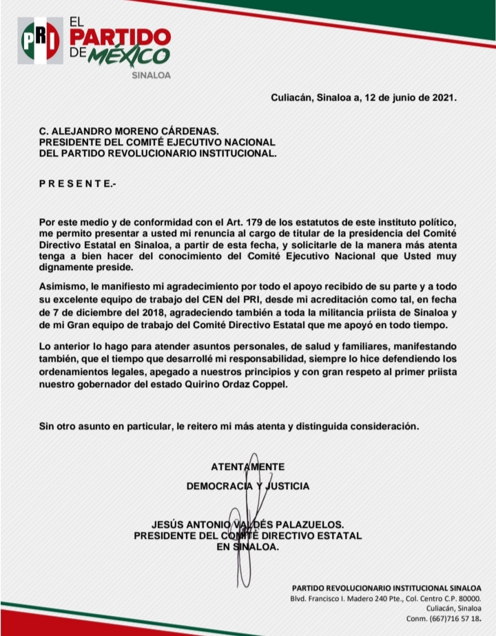 A través de un comunicado dirigido a Alejandro Moreno Cárdenas, presidente del CEN del PRI, Jesús Valdés presentó dicha renuncia, como presidente, con carácter de irrevocable a partir de la fecha para atender asuntos personales y familiares.