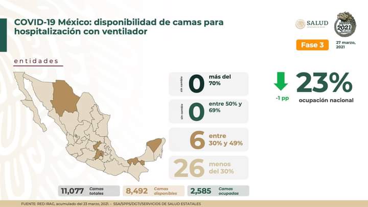 A nivel nacional, 80% de camas de hospitalización general están disponibles y 20% ocupadas. En camas con ventiladores, 77% están disponibles y 23% ocupadas.