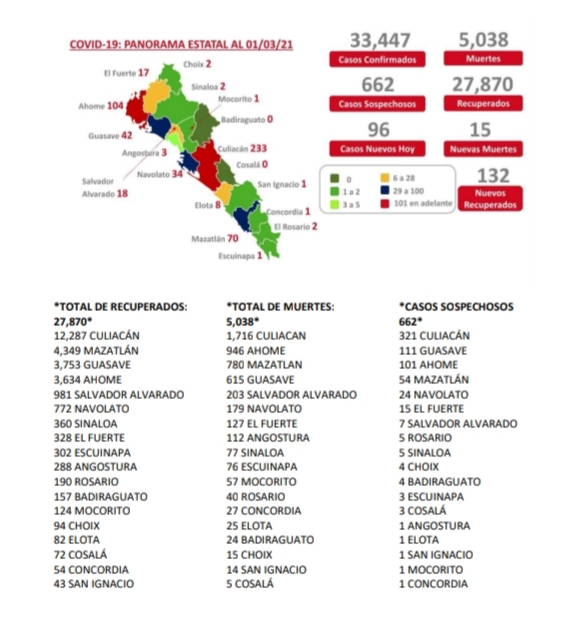 CULIACÁN, Sin.- Sinaloa reportó este lunes 15 nuevos fallecimientos reportados en las últimas 24 horas en 3 municipios (Culiacán 10, Ahome 3, Mazatlán 2).
