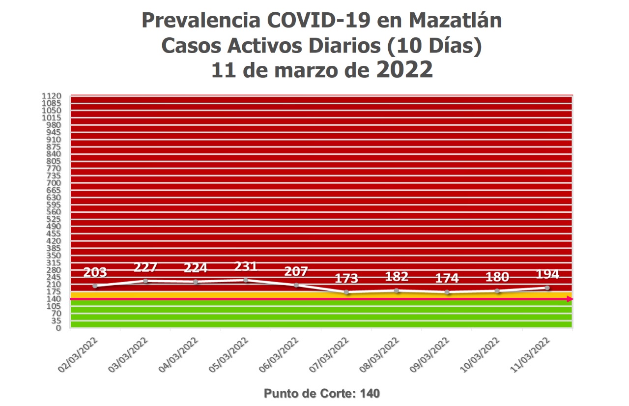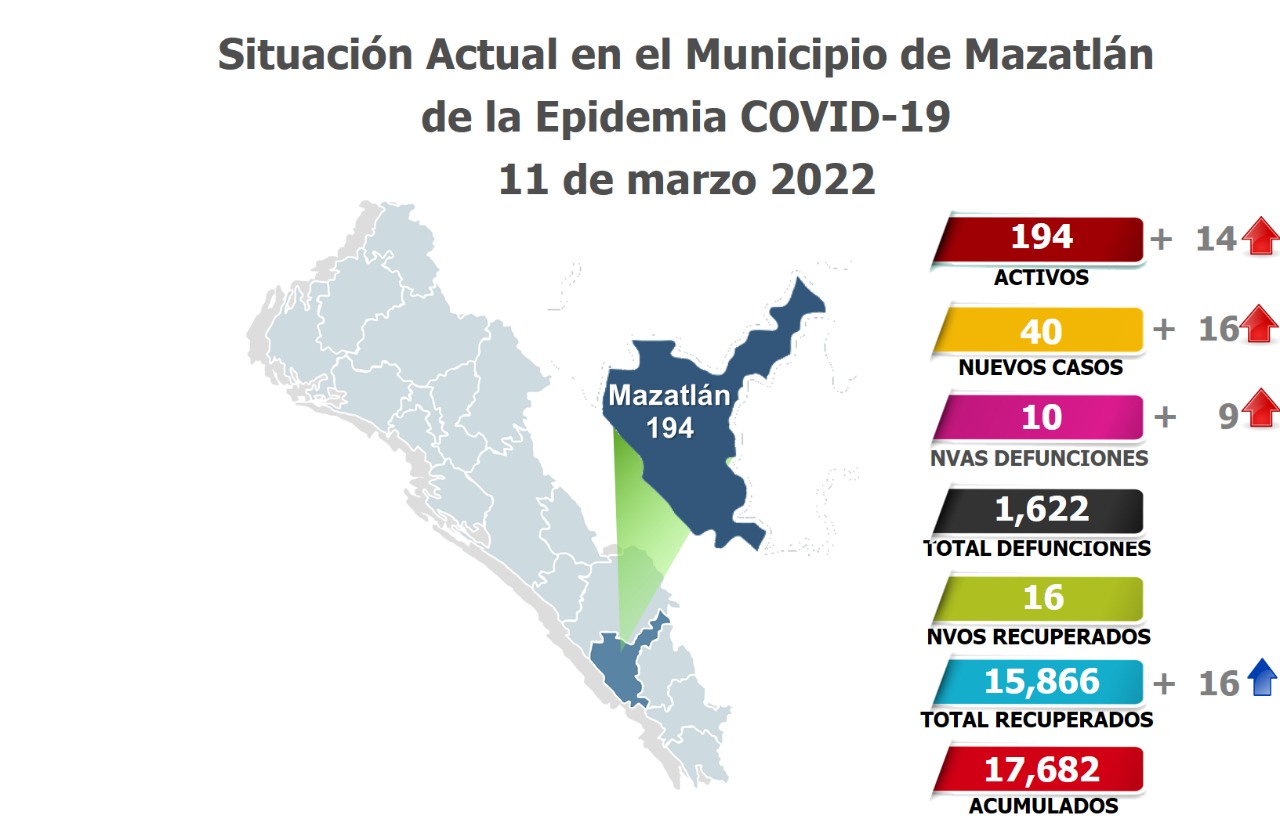 MAZATLÁN, Sin. – El día de hoy sumamos a plataforma 16 recuperados, 40 nuevos casos y 10 defunciones debido a una actualización de la base de datos, colocando en 194 (+14) los casos activos en el municipio de Mazatlán.