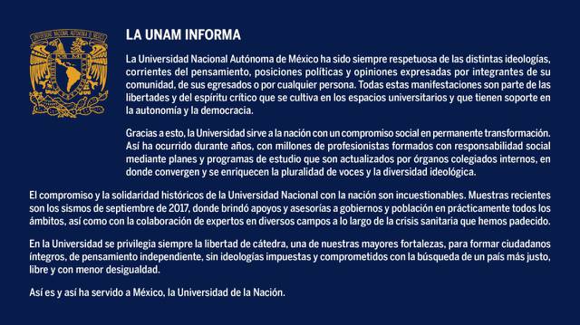 De la misma forma, la UNAM aseguró que siempre ha sido respetuosa de las distintas ideologías, corrientes del pensamiento, posiciones políticas y opiniones.