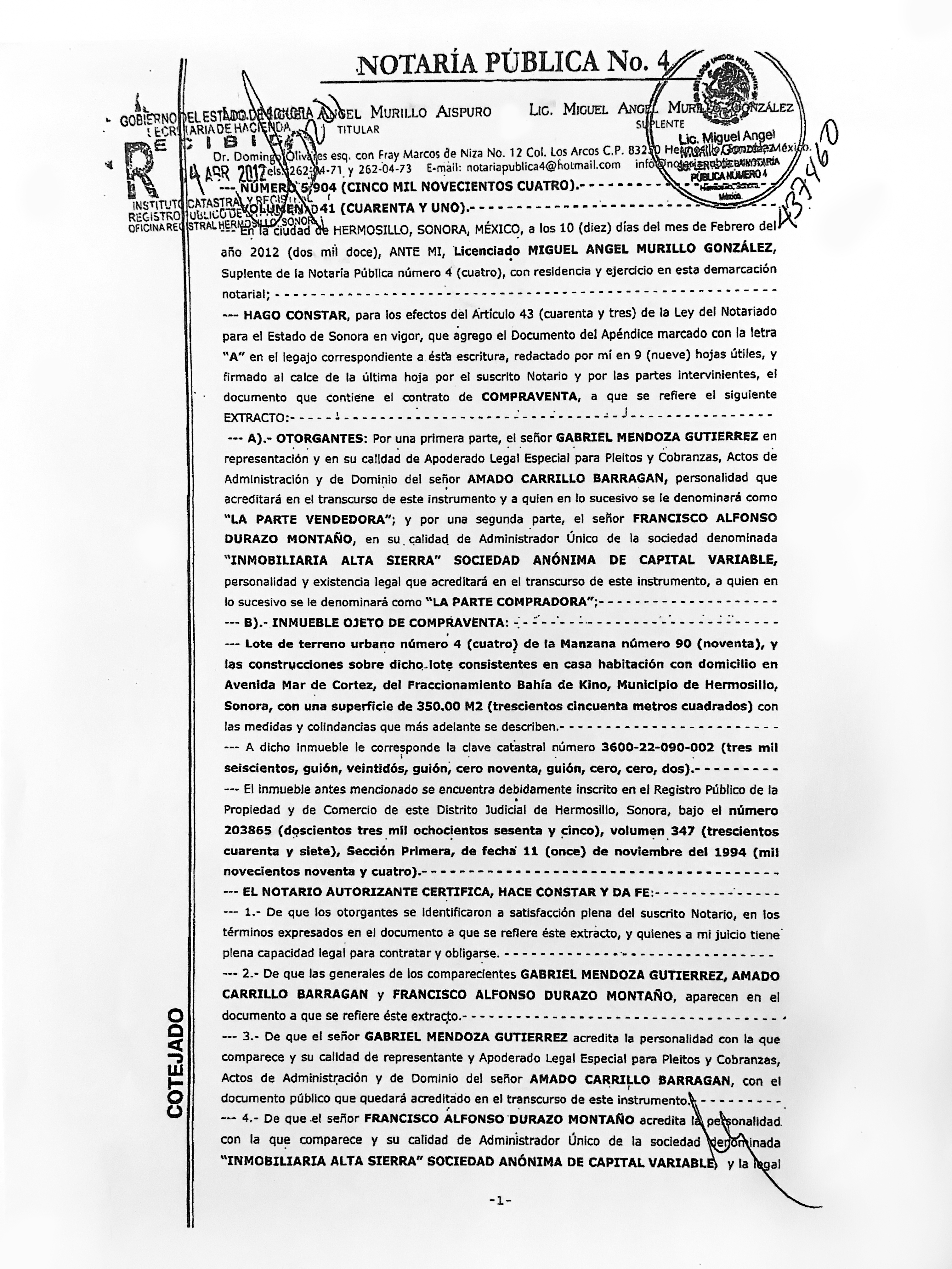 Registros oficiales revelan que la compra-venta de la propiedad se formalizó en la Notaría Pública número 4 de la ciudad de Hermosillo, cuyo titular, Miguel Ángel Murillo Aispuro, dio por cubiertos todos los requisitos presentados.