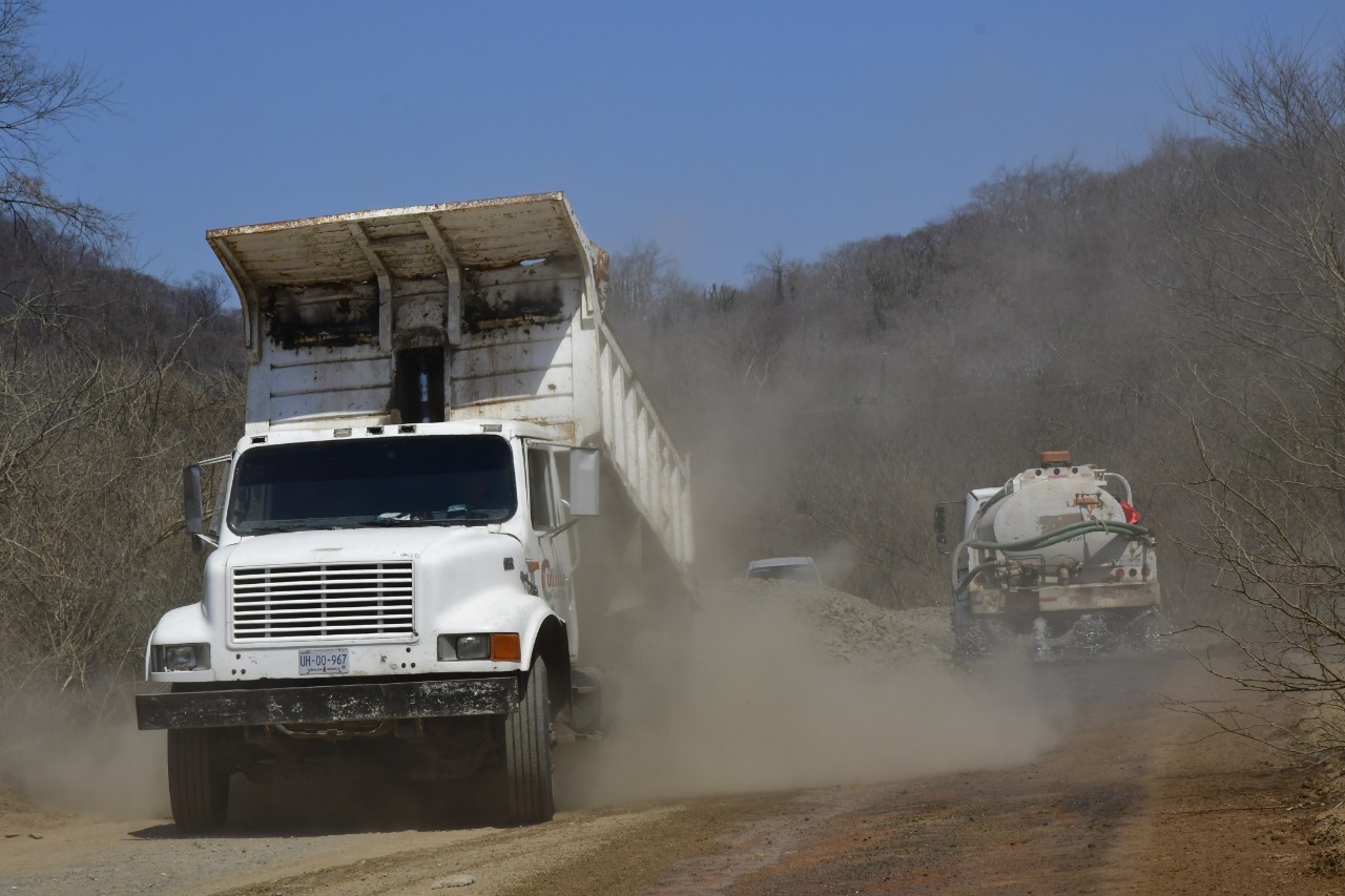 En este lugar, la Secretaría de Obras Públicas realiza el trabajo de revestimiento del camino con el uso de material balestre sobre el suelo original, que una vez compactado, durante la temporada de lluvias permitirá la circulación vehicular sin contratiempos por la zona.