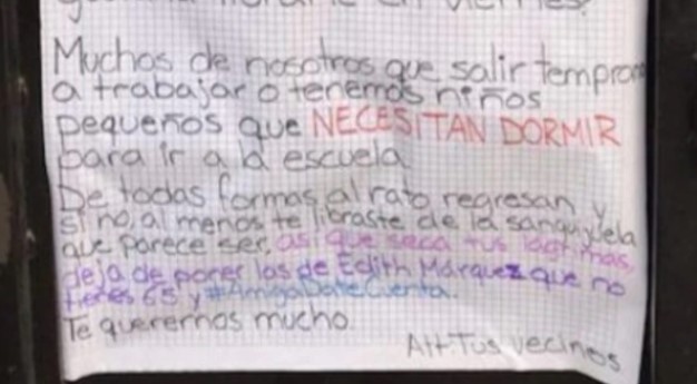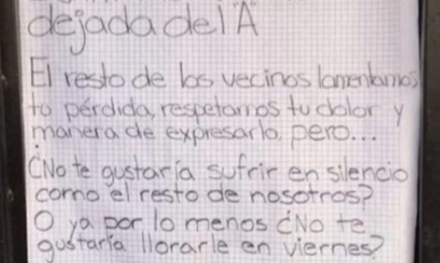 “Estimada vecina dejada del A. El resto de los vecinos lamentamos tu pérdida, respetamos tu dolor y manera de expresarlo pero…¿no te gustaría sufrir en silencio como el resto de nosotros? o ya por lo menos ¿no te gustaría llorarle en viernes? Muchos de nosotros tenemos que salir temprano a trabajar o tenemos niños pequeños que necesitan dormir para ir a la escuela”, escribió en una parte del cartel.