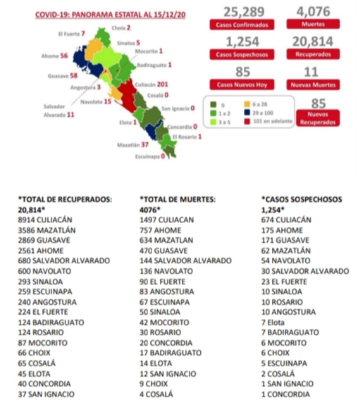 CULIACÁN, Sin.- La Secretaría de Salud reportó 85 nuevos casos de contagios, 11 nuevos fallecimientos y un 81% de camas disponibles en el estado.