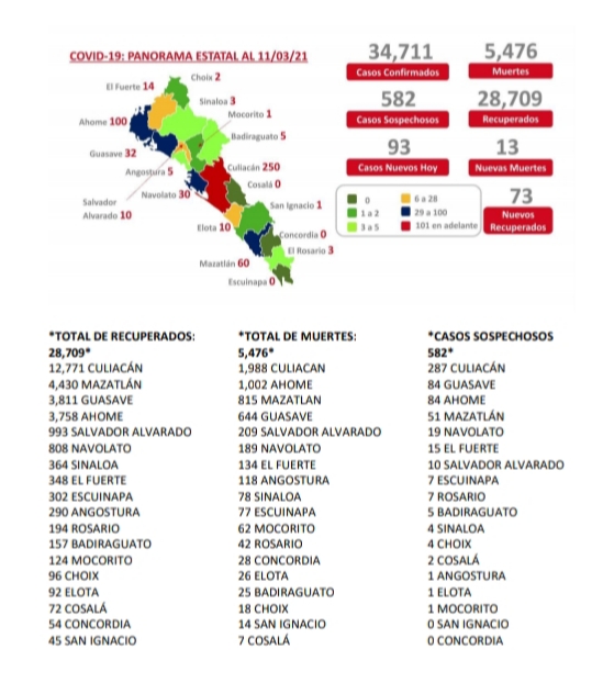 CULIACÁN, Sin.- Sinaloa registró este miércoles 13 nuevos fallecimientos reportados en las últimas 24 horas.