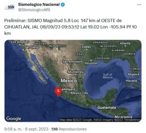 GUADALAJARA, Jal.- Tras registrarse alrededor de las 09:50 horas de este viernes un sismo, con magnitud preliminar de 5.8 a 147 kilómetros del municipio de Cihuatlán, Jalisco, el Servicio Sismológico Nacional (SSN) informó de un segundo temblor, este con epicentro a 199 km del mismo municipio, pero con magnitud de 5.9.