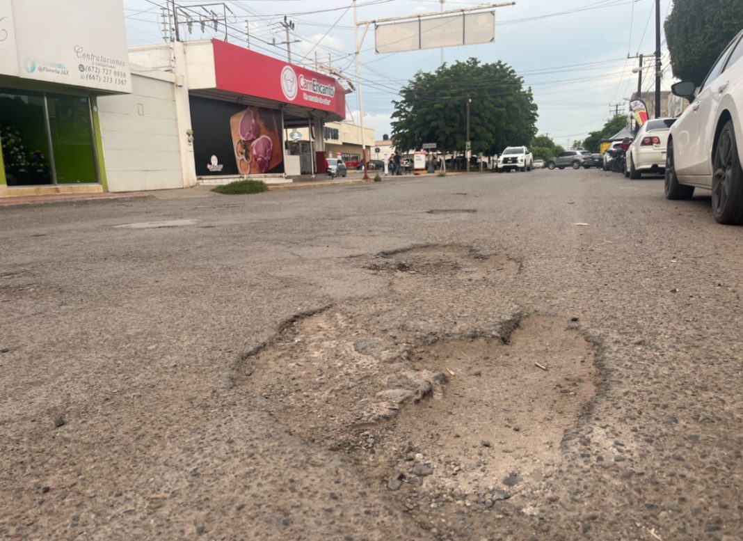 NAVOLATO, Sin.- Una serie más de 100 baches entre pequeños y largos de extienden a lo largo de la calle Jorge Almada, la calle céntrica de la ciudad de Navolato con más hoyos de este tipo sobre la vialidad más importante.