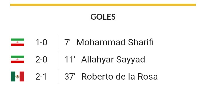 Mohammad Sharifi, al minuto siete de penalti, y Allahyar Sayyad, al 11, consiguieron las anotaciones del triunfo iraní, mientras que Roberto de la Rosa, al 37, descontó por México, en juego que se realizó en el estadio Pandit Jawaharlal Nehru de la ciudad de Goa.