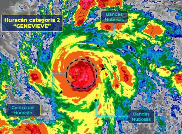 CIUDAD DE MÉXICO.- El centro del Huracán “Genevieve” de categoría 2 en la escala Saffir-Simpson, se localiza al sur de las costas de Colima