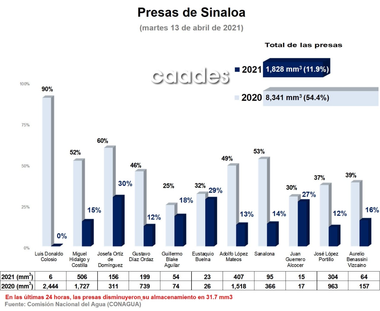 CULIACÁN, Sin.- Las presas del estado cuentan con un almacenamiento de 1,828.0 mm3 de agua, que representa el 11.9% de su capacidad.