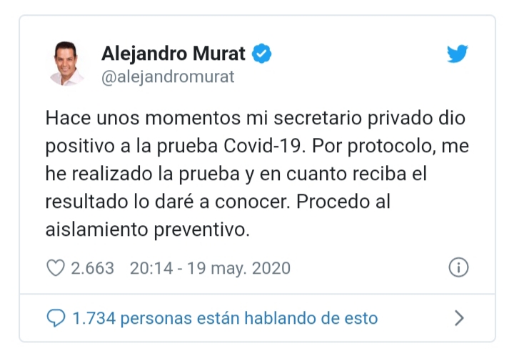 En su cuenta de Twitter, el mandatario oaxaqueño expresó que su secretario privado, Alejandro Nassar Piñeiro, dio positivo a la prueba de COVID-19.
