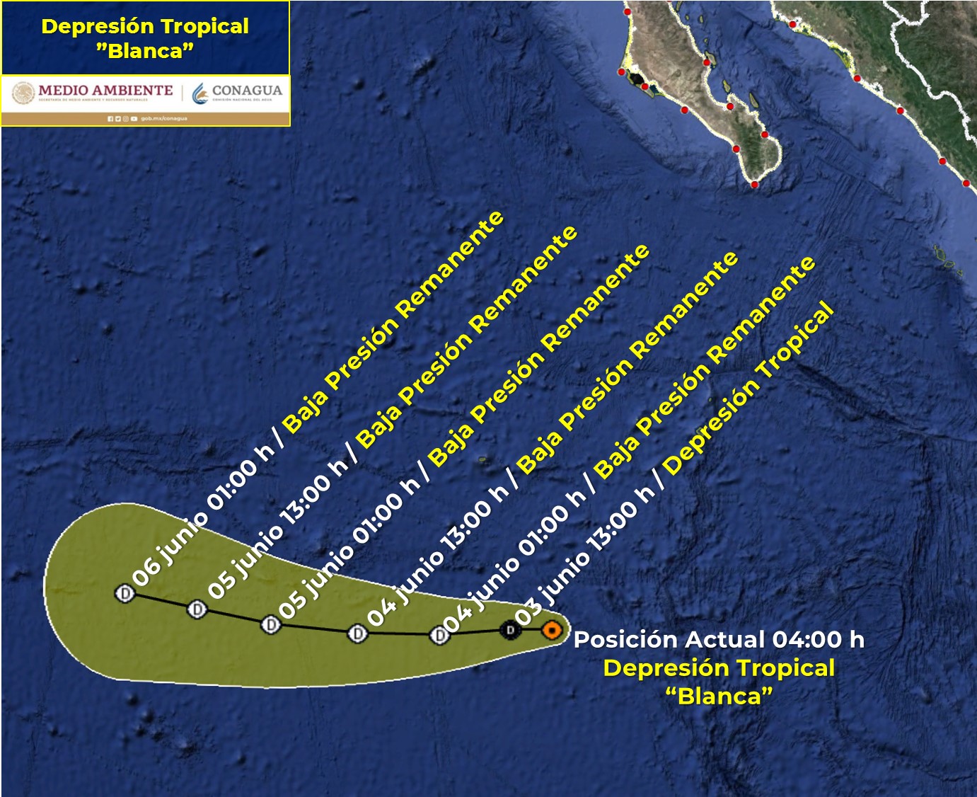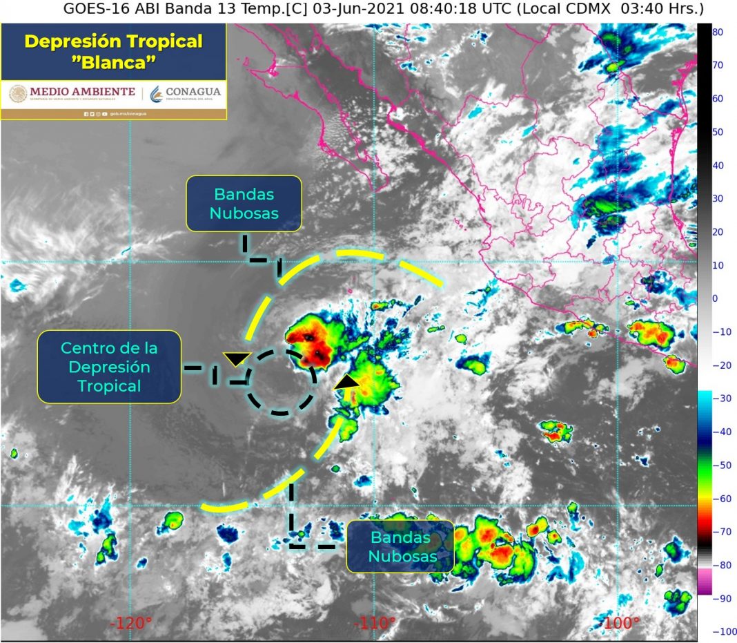 CIUDAD DE MÉXICO.- “Blanca” aún como depresión tropical, continúa alejándose de territorio mexicano, se mantiene al sur-suroeste de la Península de Baja California.