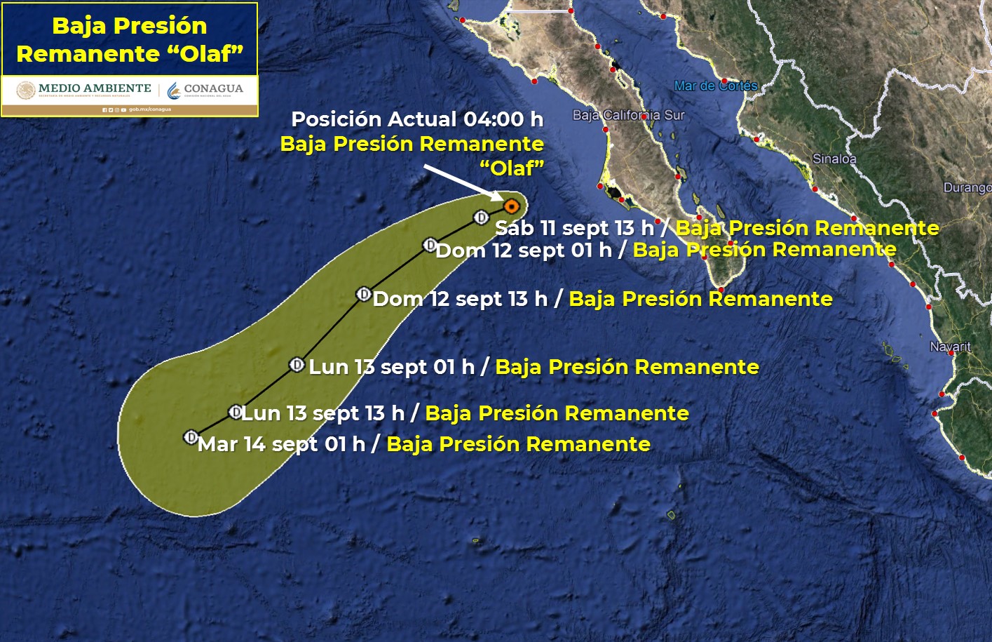 “Olaf” se ha degradado a baja presión remanente y continúa alejándose de Baja California Sur. Se ubica a 175 km al oeste-suroeste de Cabo San Lázaro, BCS.