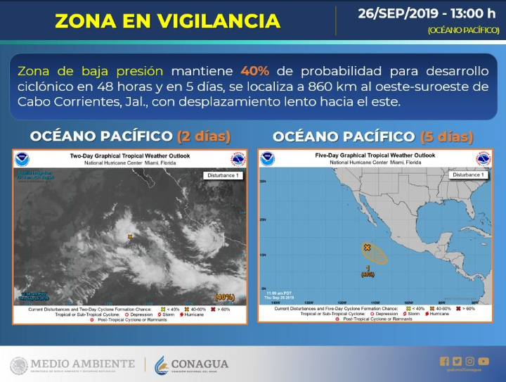 CIUDAD DE MÉXICO.- Una zona de baja presión mantiene 40 por ciento de probabilidad para desarrollo ciclónico en 48 horas, se localiza al oeste-suroeste de las costas de Jalisco. Sin afectar por el momento a México.