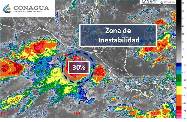 Otras zona de inestabilidad, mantiene 30 por ciento de probabilidad para desarrollo ciclónico en 48 horas, se localiza al sureste de las costas de Chiapas. Genera el ingreso de humedad hacia los estados del sureste del país.