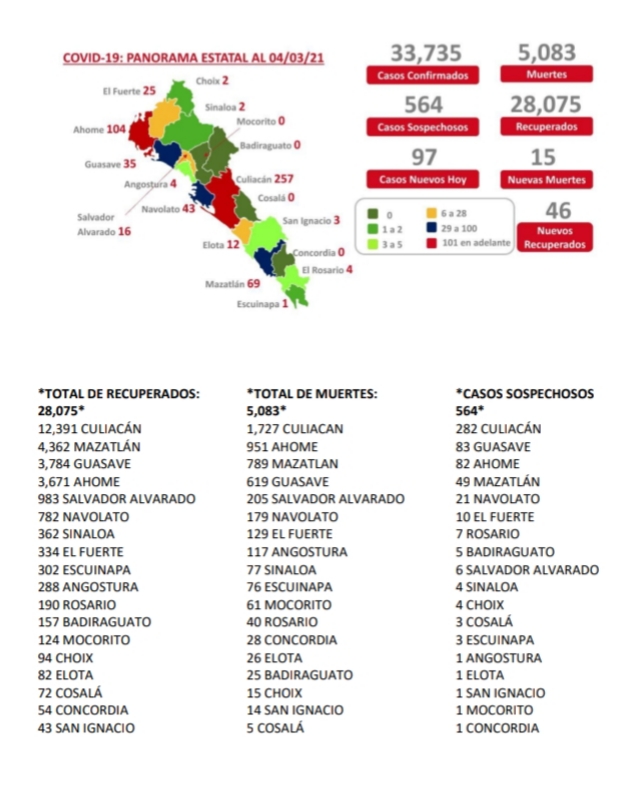 CULIACÁN, Sin.- Sinaloa registró 15 nuevos fallecimientos reportados en las últimas 24 horas