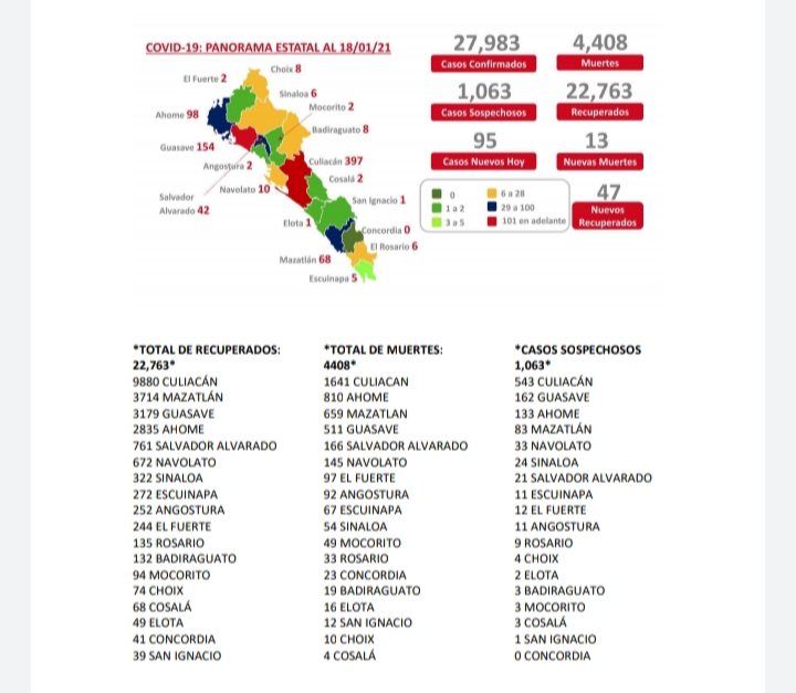 CULIACÁN, Sin.-  La Secretaría de Salud reportó 13 nuevos fallecimientos en las últimas 24 horas (Culiacán 6, Guasave 2, Salvador Alvarado 1, El Fuerte 1, Angostura 1, El Rosario 1, Elota 1).