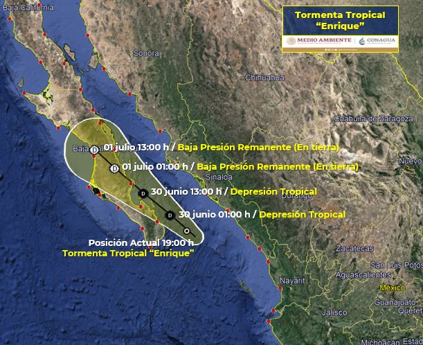 CIUDAD DE MÉXICO.- La tormenta tropical “Enrique” continúa desorganizandose y se desplaza hacia Baja California Sur, sus bandas nubosas ocasionan lluvias fuertes a puntuales intensas sobre estados del occidente y noroeste del territorio nacional.