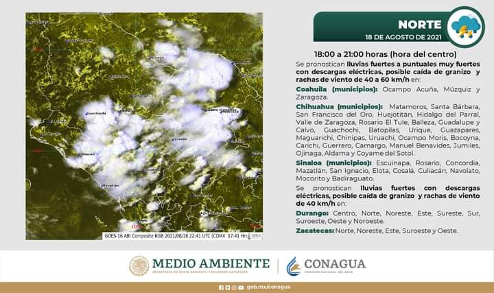 CULIACÁN, Sin.- Se pronostican lluvias las próximas horas en Escuinapa, El Rosario, Concordia, Mazatlán, San Ignacio, Elota, Cosalá, Culiacán, Navolato, Mocorito y Badiraguato