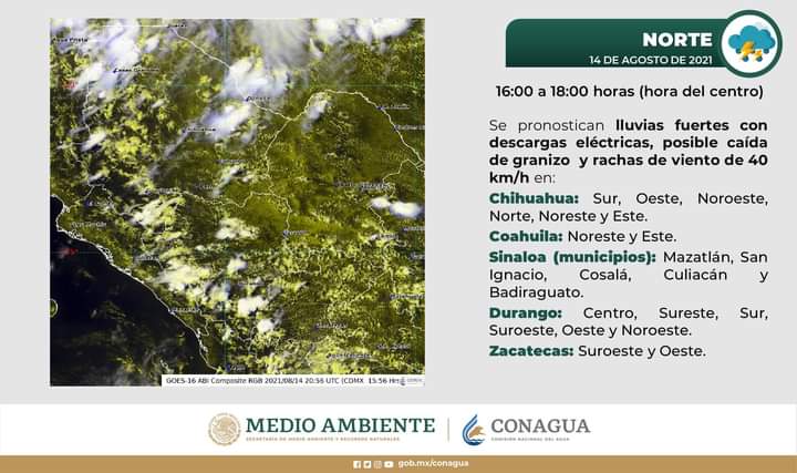 Se pronostican lluvias fuertes con lluvias puntuales muy fuertes de 50.1 a 75.0 milímetros, informó el Servicio Meteorológico Nacional.