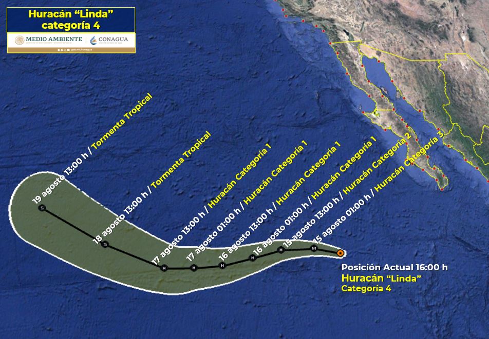 El centro del Huracán “Linda” categoría 4 en la escala Saffir-Simpson, se localiza al oeste-suroeste de las costas de Baja California Sur, sin afectar a costas mexicanas.
