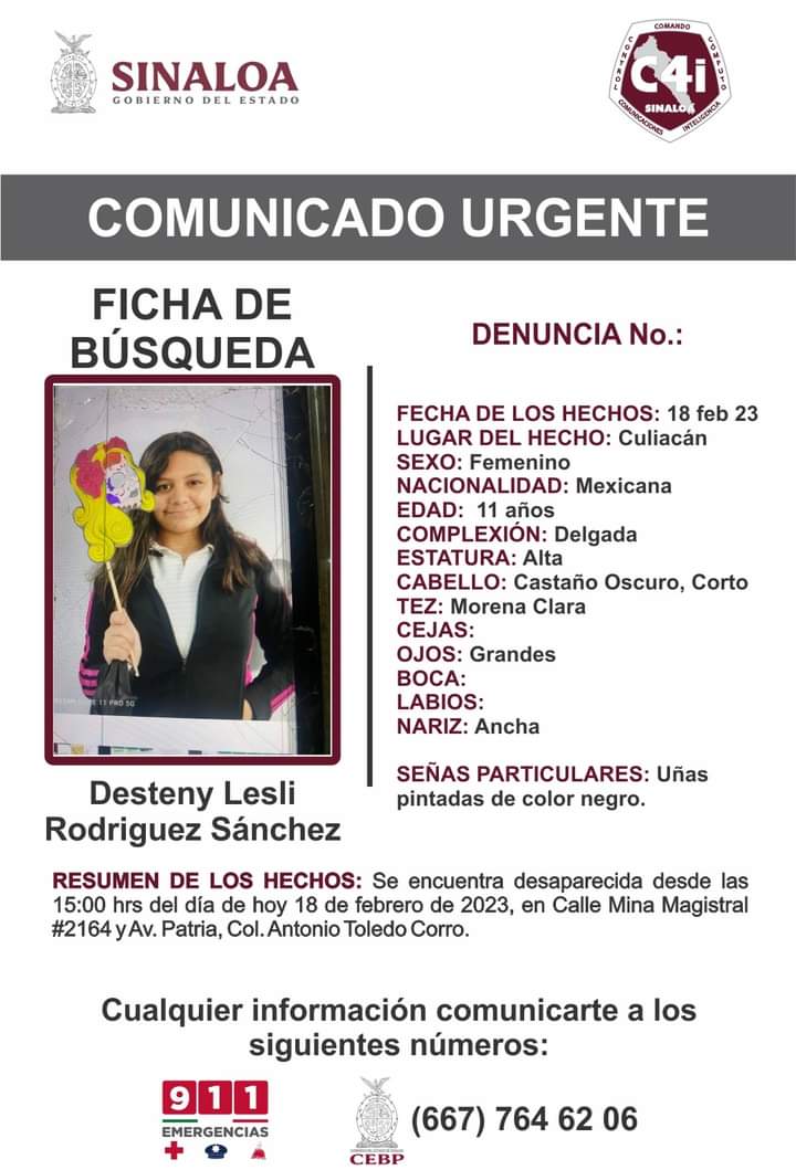 CULIACÁN, Sin.- Este domingo Sinaloa emitió una ficha de búsqueda para localizar a la menor Desteny Lesli Rodríguez Sánchez de 11 años de edad, desaparecida en la colonia Antonio Toledo Corro de Culiacán.