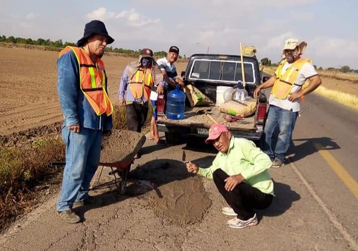 El síndico de Bachimeto, José Abraham Pérez Zamudio; trabajadores del ayuntamiento y el ciudadano Miguel Ángel, conocido como “Cañetas”, pegaron el pasado sábado una segunda jornada de relleno de hoyos con más de dos meses de antigüedad.