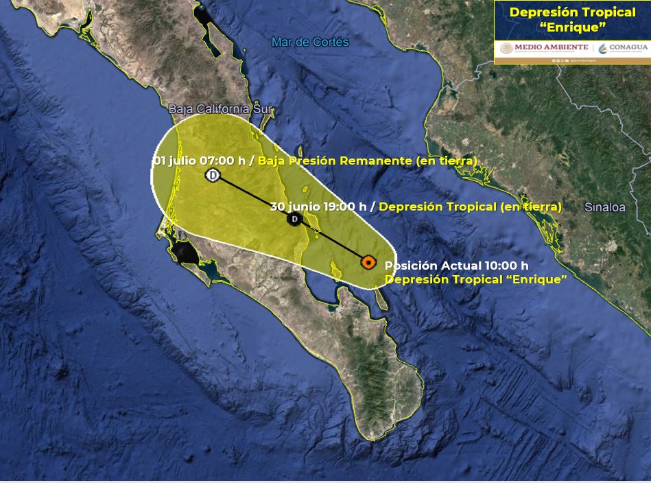 CIUDAD DE MÉXICO.- “Enrique” se debilita a depresión tropical frente a la costa oriental de Baja California Sur, sus bandas nubosas ocasionarán lluvias puntuales muy fuertes en Baja California Sur, Sonora, Sinaloa, Durango y Chihuahua.