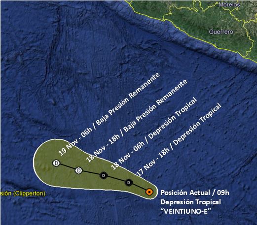 La Depresión Tropical “21-E” se localiza al sur-suroeste de las costas de Guerrero y se desplaza hacia el oeste-noroeste.